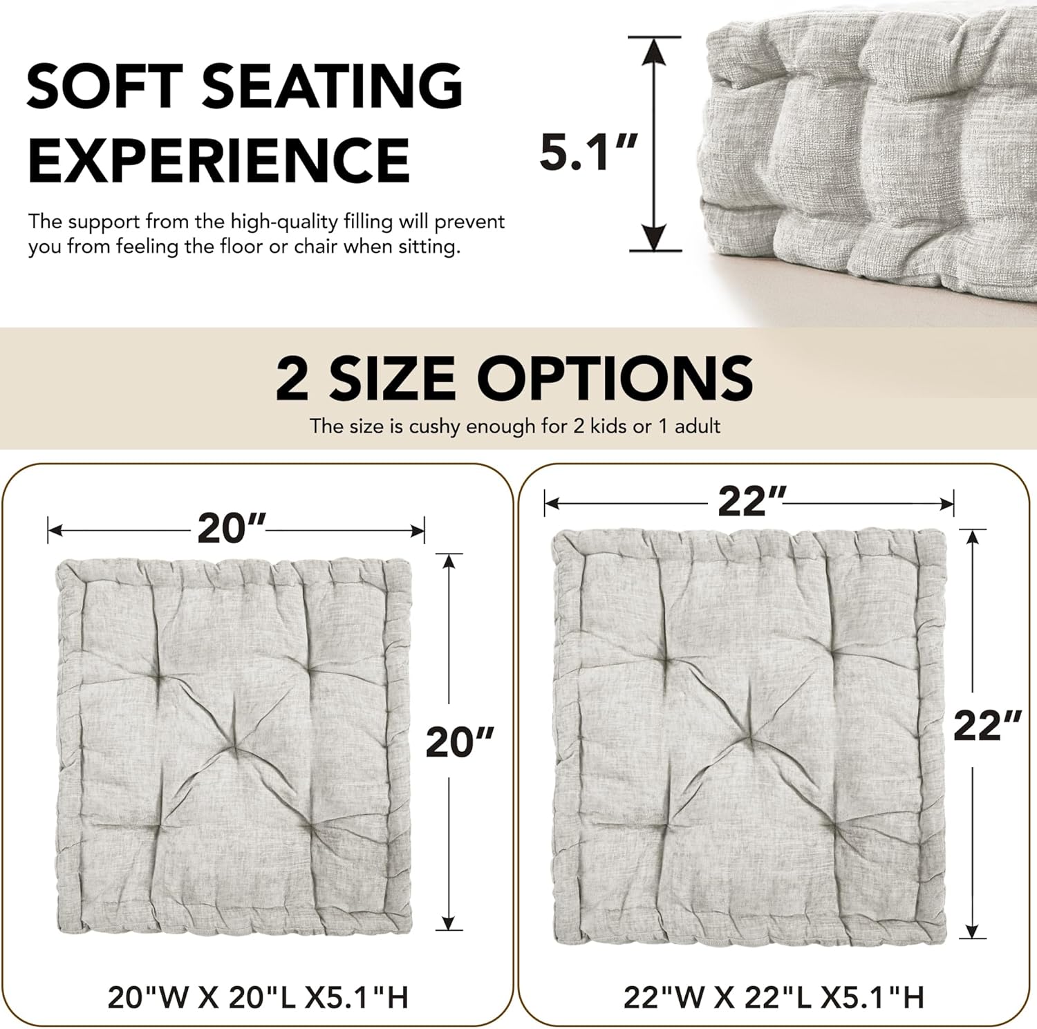 - One Size Fits All Ages: From kids to adults, this seat cushion comes in square or round shapes and two sizes (20″ and 22″), 5.1 inches thikness, perfect for everyone. Whether it’s for meditation, yoga, or simply relaxing, you’ll find it to be your indoor companion, wrapping you in cozy comfort.